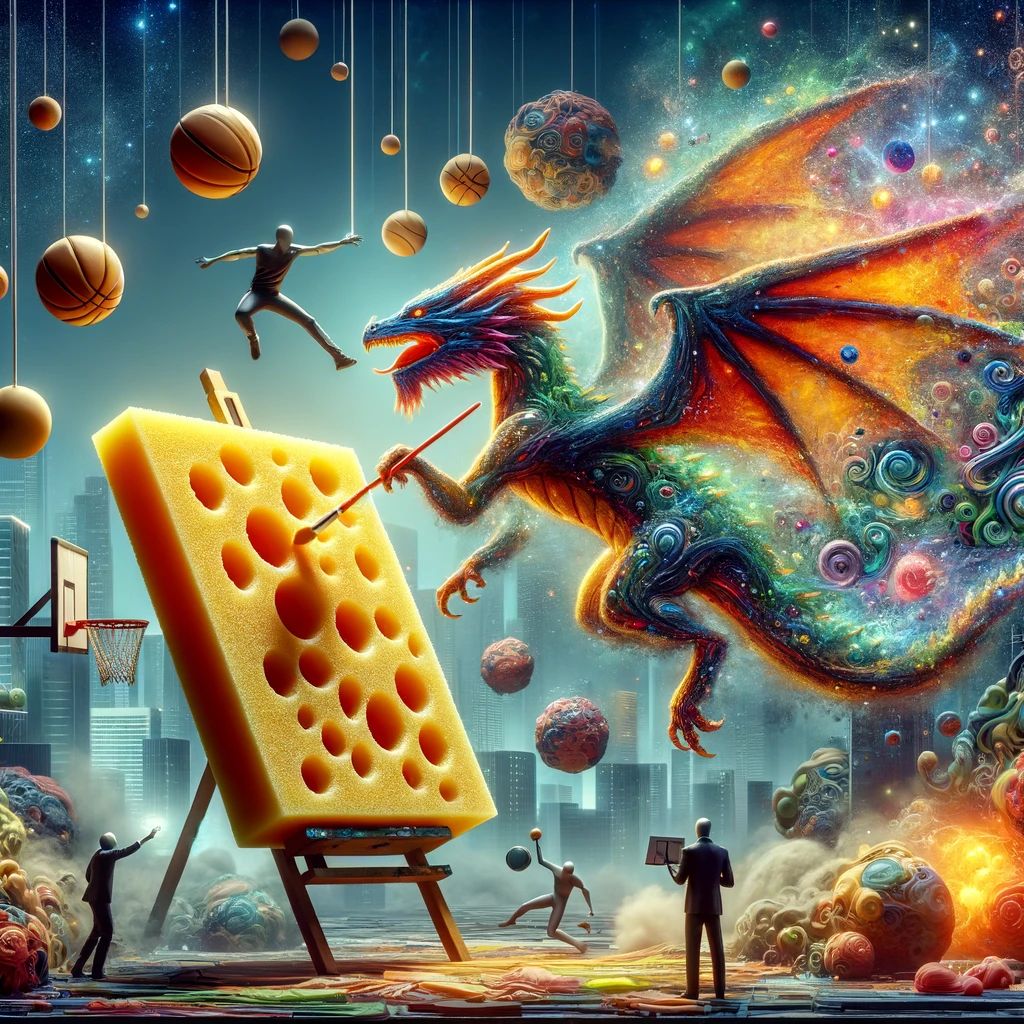 It's like if you asked the sponge to not just tell you what it knows about dragons, but to draw you a picture of a dragon playing basketball. The sponge hasn't seen this before, but it understands what dragons and basketball are, so it combines these ideas in a creative way to make something new and exciting.