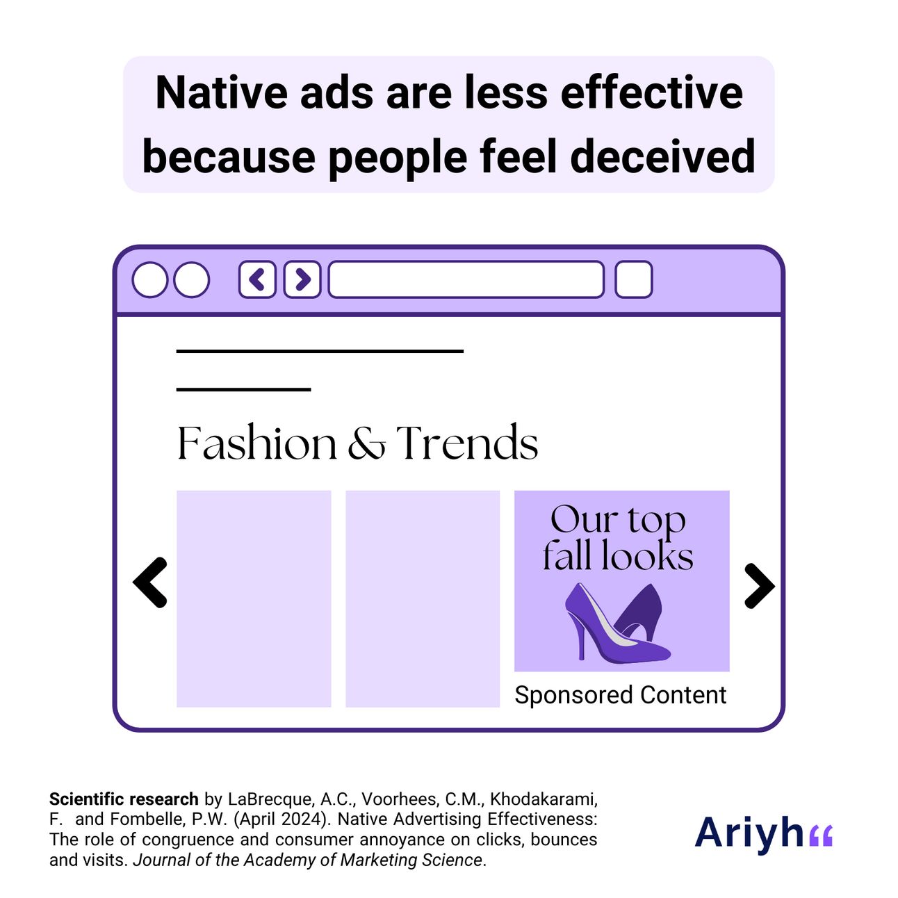 🧠 Reason: Native ads blend seamlessly with website content, making us more likely to engage with them, unlike traditional banner ads which we often ignore due to their blatant appearance. However, when we unknowingly click on a native ad and are redirected to an advertiser's page, it leaves us feeling misled.